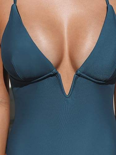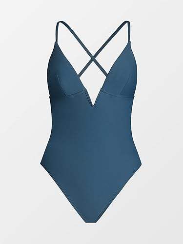 ชุดว่ายน้ำวันพีซผู้หญิง แห้งเร็ว ยืดหยุ่นสูง แบบไม่มีแขน คอวี ดีไซน์เว้าหลัง สีพื้น