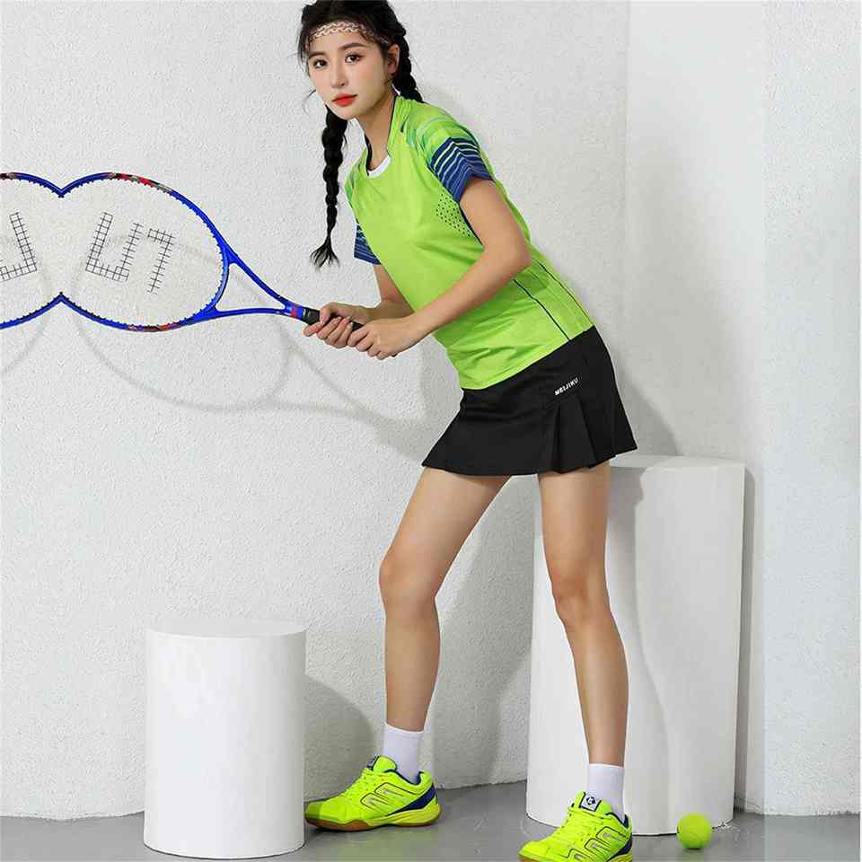 ชุดกระโปรงกีฬาสองชิ้นป้องกันการเปิดรับแสงสำหรับผู้ชายและผู้หญิงขนาดใหญ่เสื้อผ้าเทนนิสแบดมินตันแขนสั้นแห้งเร็ว