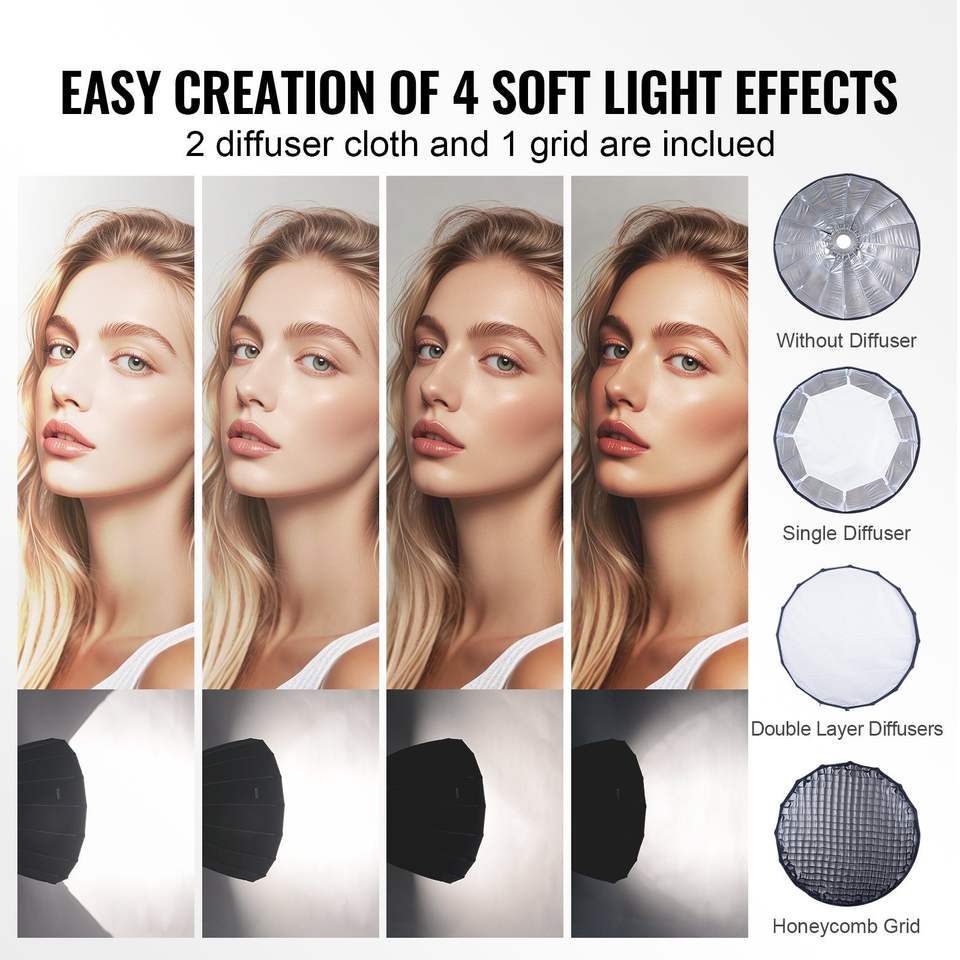 ซอฟต์บ็อกซ์พาราโบลาแบบพกพาถอดประกอบเร็ว 33/850 มม. น้ำหนักเบา 4 ดวงไฟ ขั้วต่อแบบยูนิเวอร์แซล Bowens สำหรับไฟถ่ายภาพ