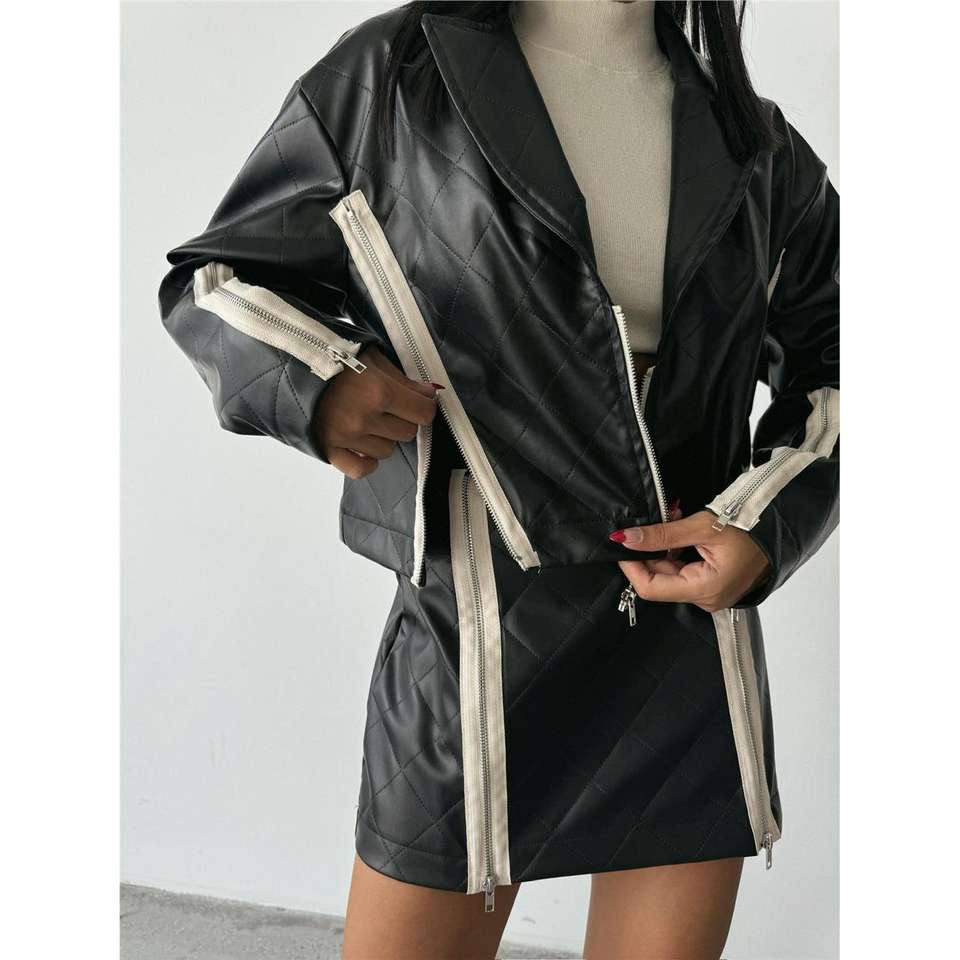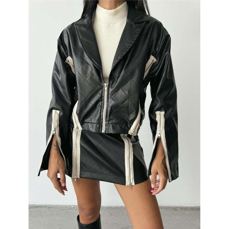 เสื้อแจ็คเก็ตหนังทรงครอปแบบควิลท์ พร้อมซิป แต่งดีเทลสีดำ