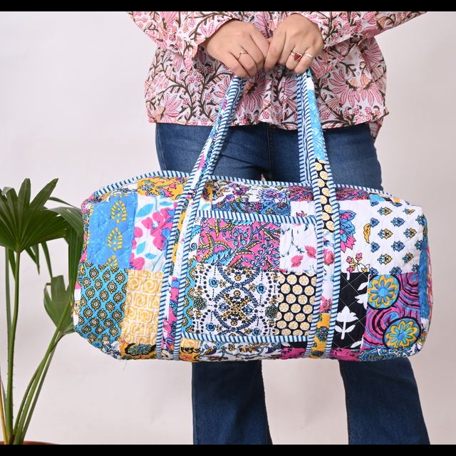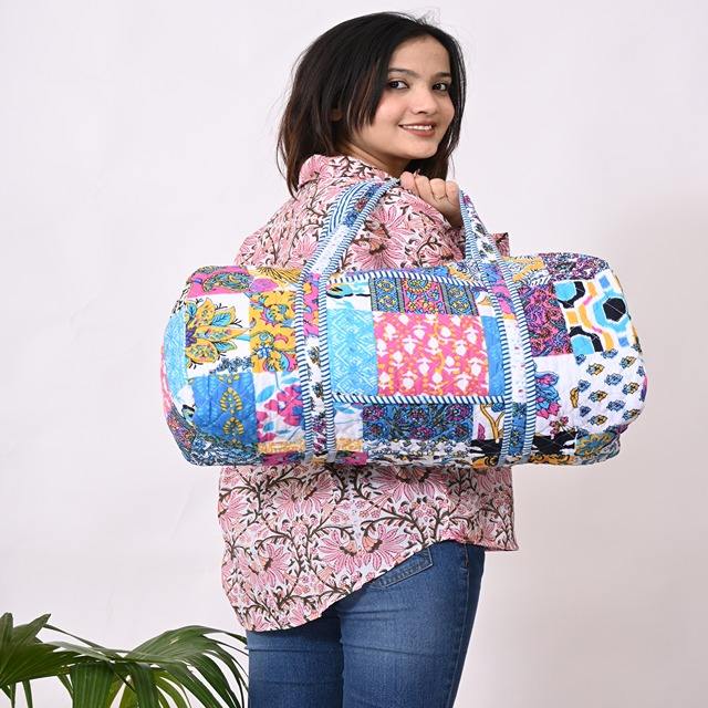 กระเป๋าผ้าคอตตอนบุนวมกระเป๋าช้อปปิ้งและเดินทางสำหรับสัปดาห์ทำด้วยมือของอินเดียพร้อมพิมพ์ลายบล็อกกระเป๋าผ้าทอมีสไตล์สำหรับผู้หญิง