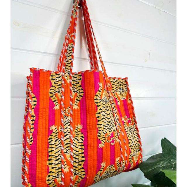 กระเป๋าโท้ทผ้าฝ้ายลายควิลท์พิมพ์ลายด้วยมือ สีส้มชมพู ขนาดใหญ่ แบบสองด้าน ใช้ได้ทั้งสะพายไหล่และถือ เหมาะสำหรับการเดินทาง