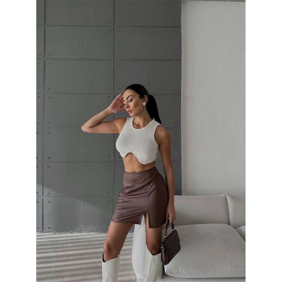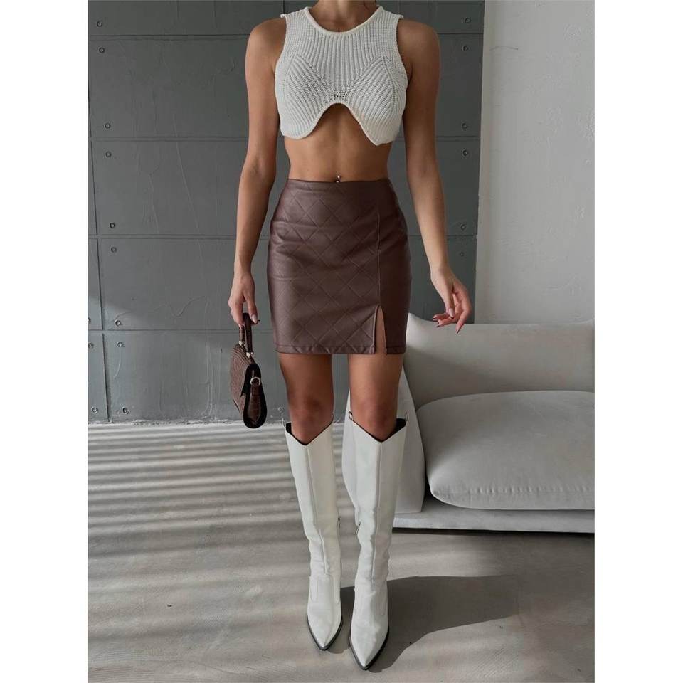 กระโปรงทรงดินสอหนังแท้แบบเย็บติดกัน ผ่าข้าง สีน้ำตาล เอวทรงเอ็มไพร์ ผ้าถักผสมสแปนเด็กซ์ แบบเรียบ ตกแต่งขนนกและโบว์
