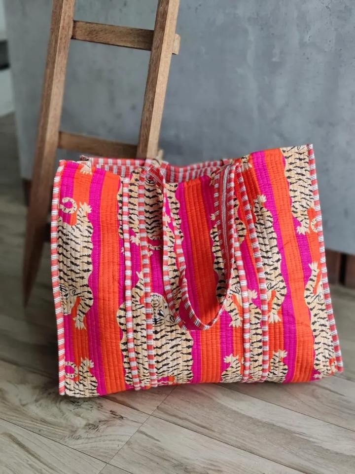 กระเป๋าโท้ทผ้าฝ้ายแท้ทำมือจากอินเดีย ลายควิลท์แบบเปิด สวยงาม เหมาะสำหรับใส่ไปเที่ยวทะเล งานปาร์ตี้ หรือเดินทาง ลายเสือ