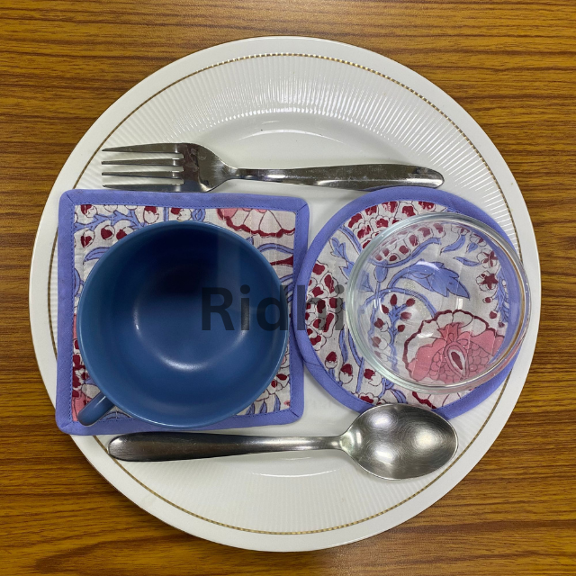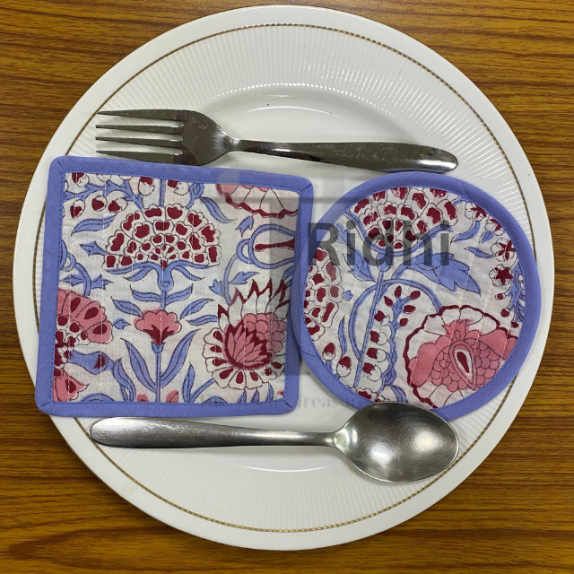 Quilted Piping Circle Coasters Gift Set 5x5" Hand Block Print Tea Mug Mats Boho Table Decor Handmade Kitchen Accessories