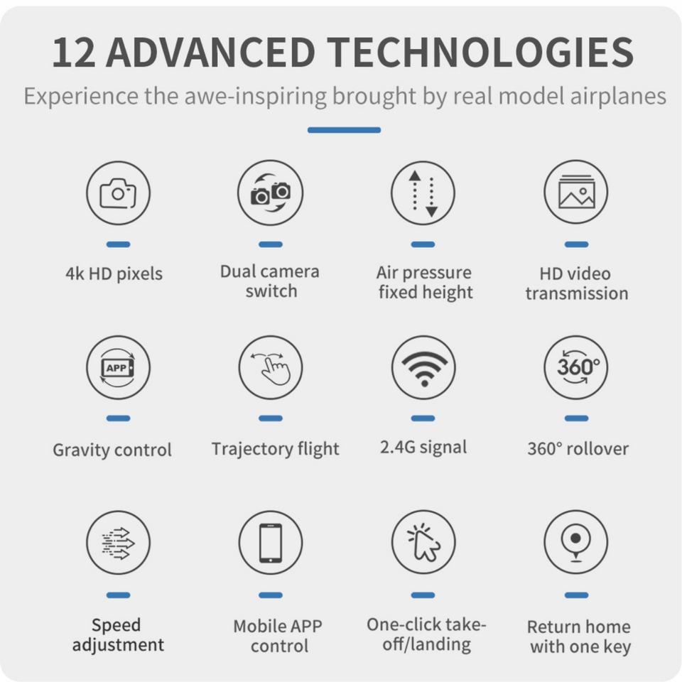 โหมด Headless, ความสูงโหมด Hold, พร้อมกล้อง, 3D พลิก, One Key Takeoff/Landing, แอปควบคุม, With Remote Control