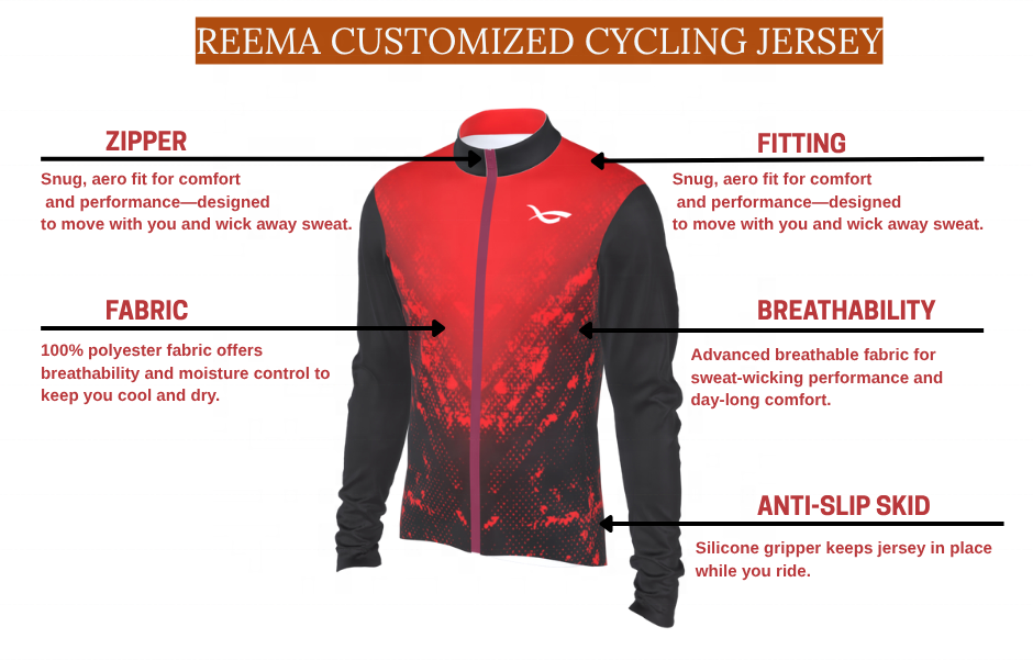 เสื้อจักรยาน REEMA แบบสั่งทำพิเศษ ระบายอากาศได้ดี น้ำหนักเบา ทนทาน เป็นมิตรกับสิ่งแวดล้อม แห้งเร็ว ทันสมัย ผลิตจากโพลีเอสเตอร์ 100% ทรง Unisex เหมาะสำหรับนักปั่นมืออาชีพ