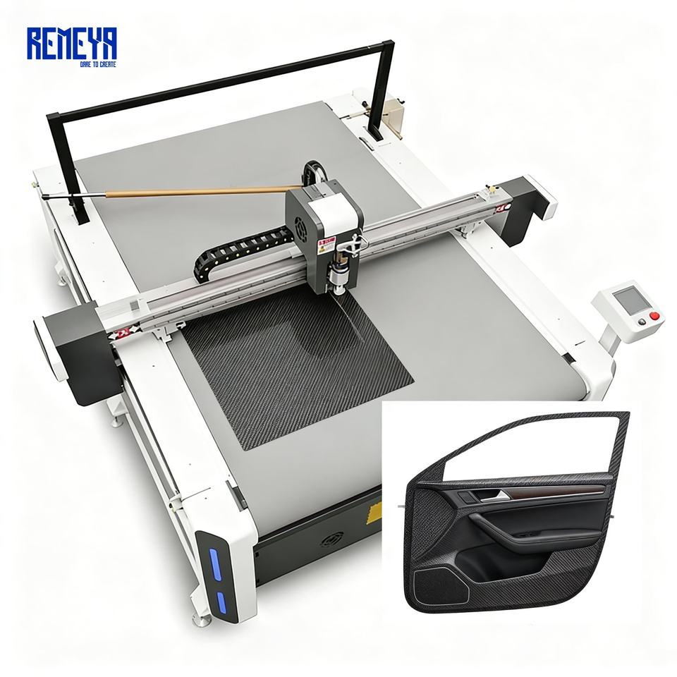 เครื่องตัดพรมปูพื้นรถยนต์อุตสาหกรรม REMEYA 220V พร้อมโต๊ะยึด PLC มอเตอร์กำลัง 90KW แกนแบริ่ง