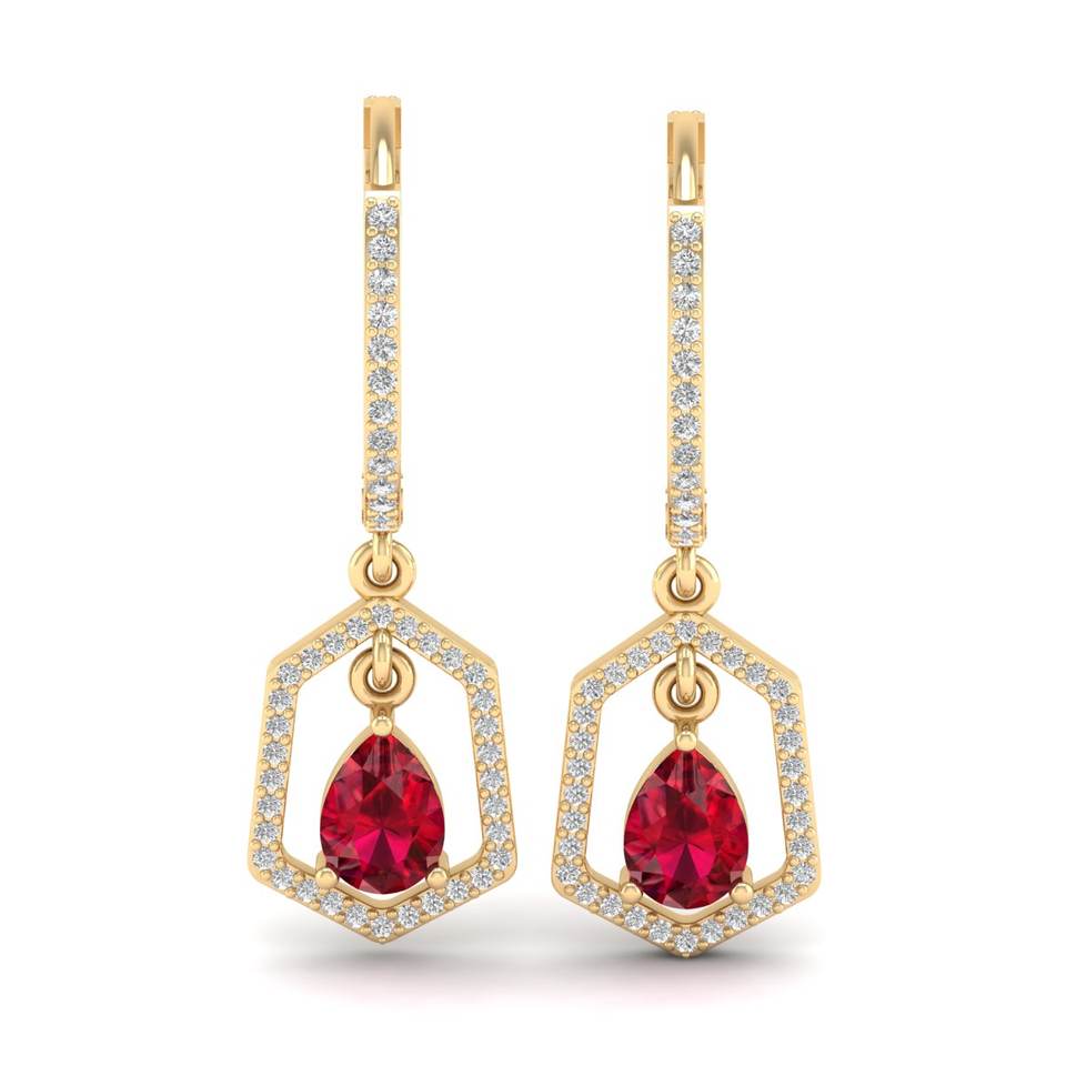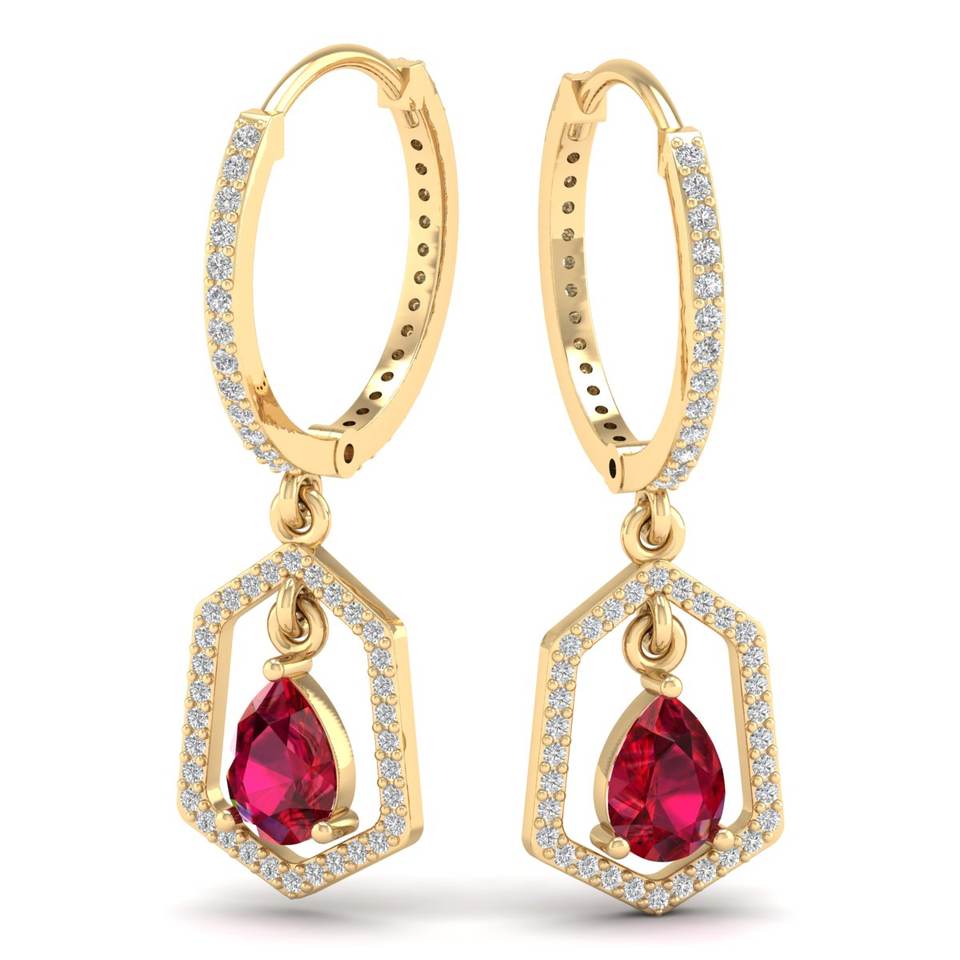 ต่างหูห่วงประดับเพชรโมอิสซาไนต์และพลอยทับทิมทรงหยดน้ำ 1.5 กะรัต ดีไซน์พิเศษ REYES ทองคำแท้ 14K 18K ของขวัญสำหรับผู้หญิง