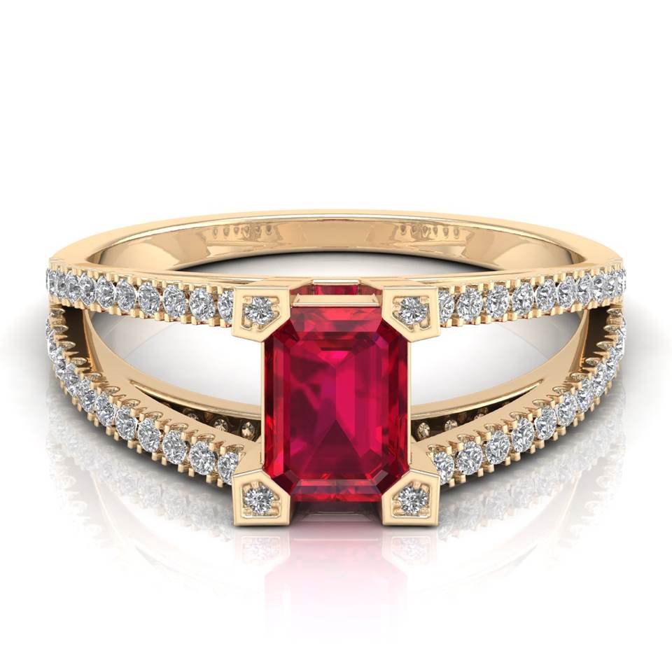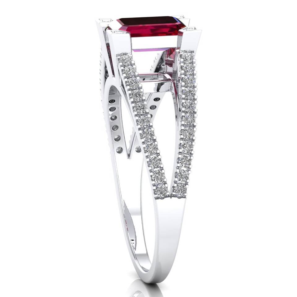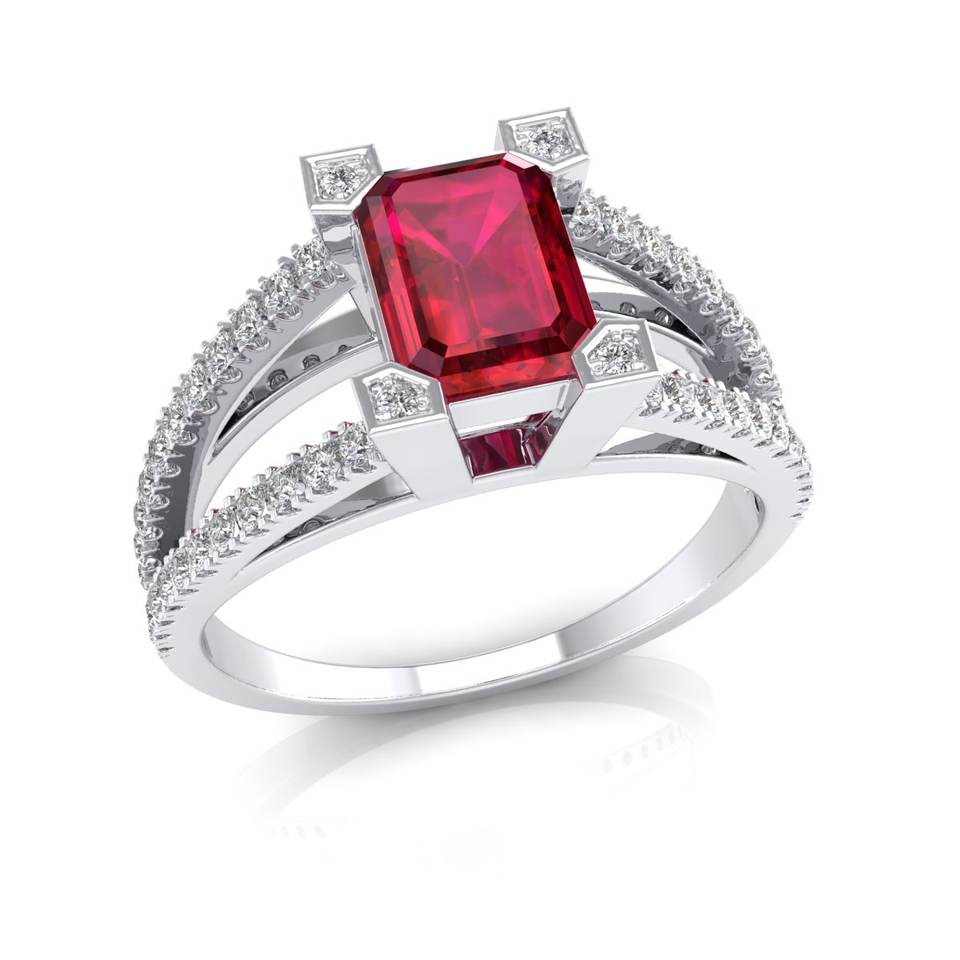 แหวนเงินแท้ 925 รับรองโดย GRA ประดับด้วยมอสซาไนต์ทรงเอเมอรัลด์ 1 เม็ด พร้อมพลอยทับทิม 1 เม็ด