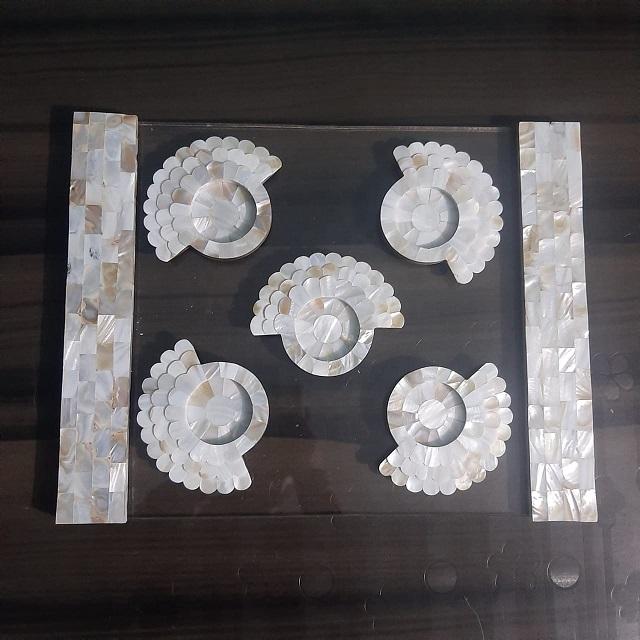 RF หัตถกรรมจากอินเดียถาดเสิร์ฟพร้อมชุดจานรองแก้วทำจากไม้ไข่มุก6ชิ้น