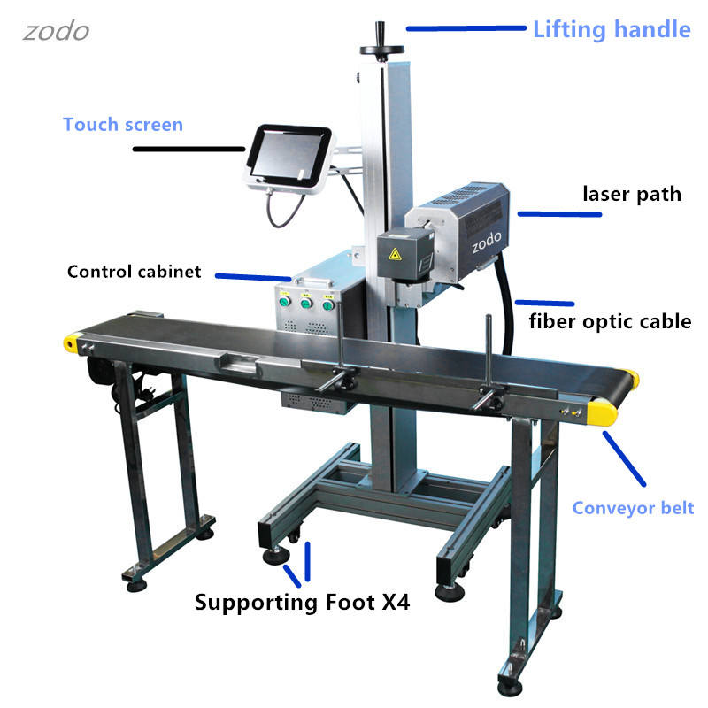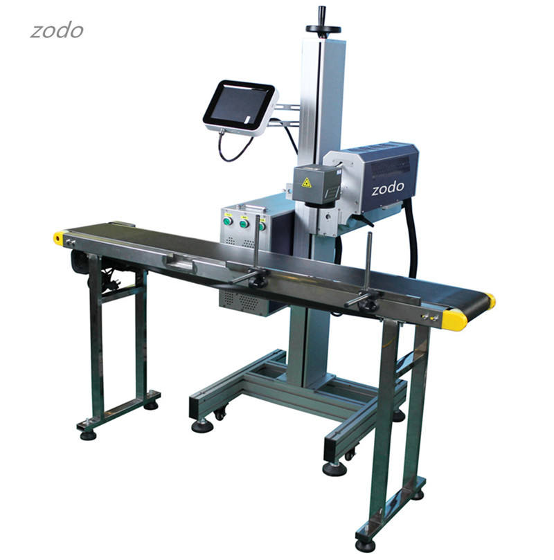 เครื่องทำเครื่องหมายเลเซอร์บิน Co2 RF40w พร้อมสายพานลำเลียงสำหรับบรรจุกล่องนมสายการผลิตพิมพ์วันที่บินได้