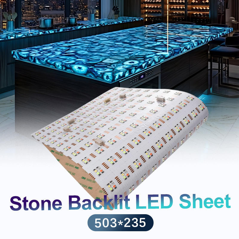 แผงไฟ LED RGBW แบบยืดหยุ่น 24VDC แผ่นไฟแบ็คไลท์ ความสว่างสูง ปรับความสว่างได้ สำหรับติดตั้งบนหินอ่อน หินออนิกซ์ ผนัง เคาน์เตอร์ ขนาด 503x235 มม.