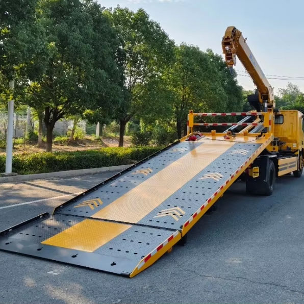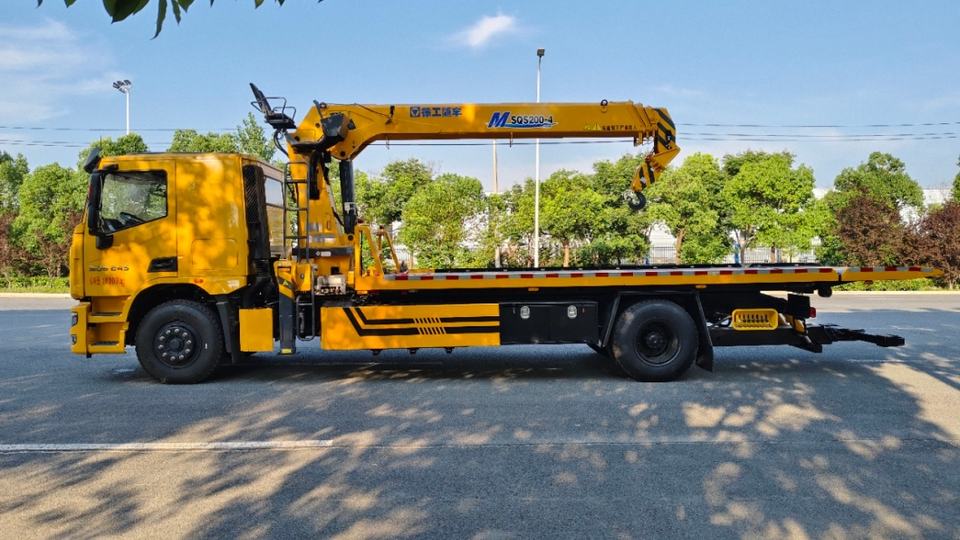รถยกพ่วงแบบแบนท้าย ขับเคลื่อนขวาและซ้าย พร้อมเครนติดตั้งบนรถ รับน้ำหนักได้ 4 ถึง 10 ตัน สำหรับยกยานพาหนะที่เสียหายหรือเครื่องจักรยกของ