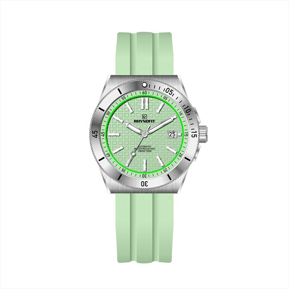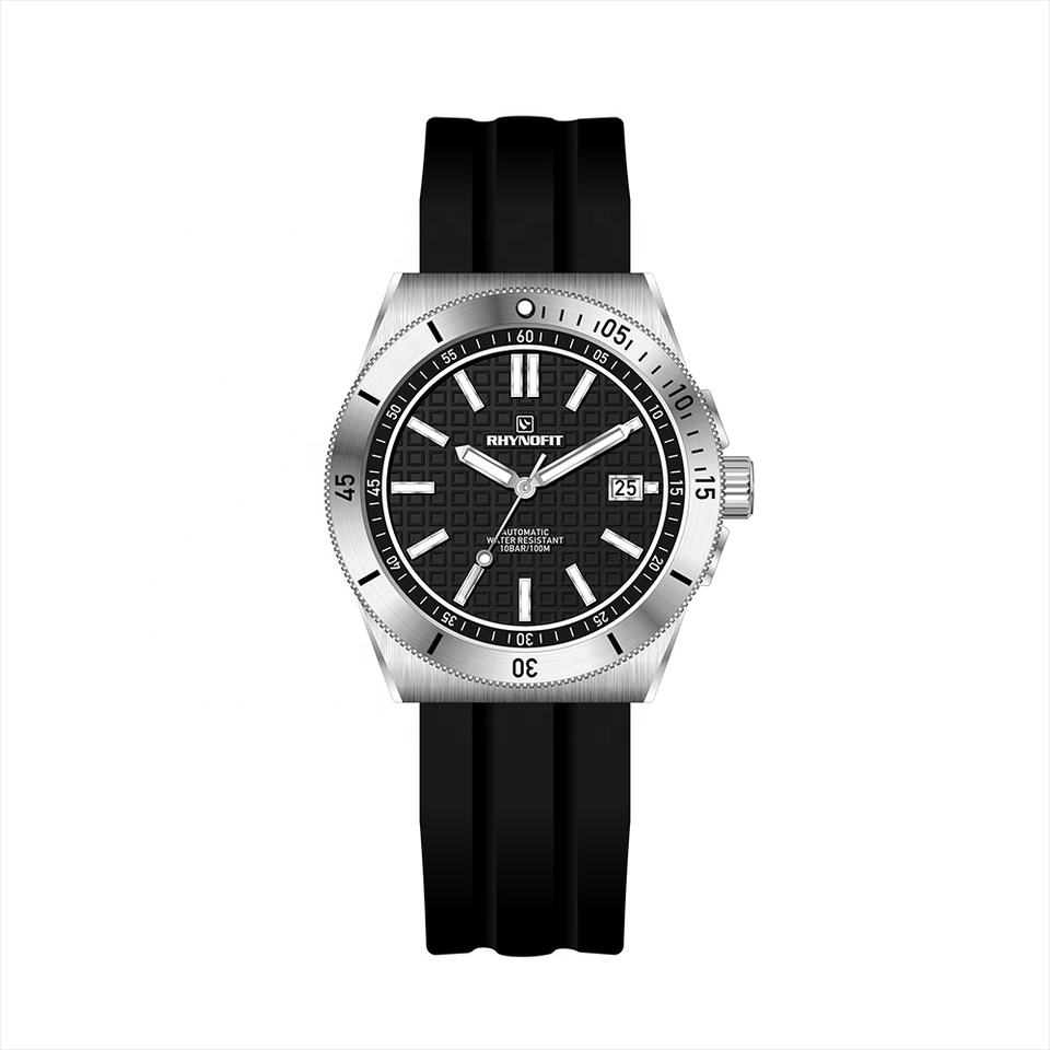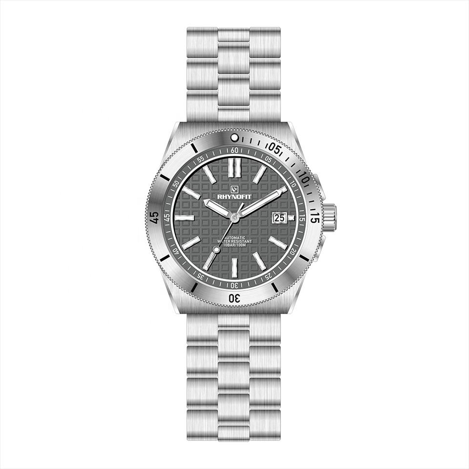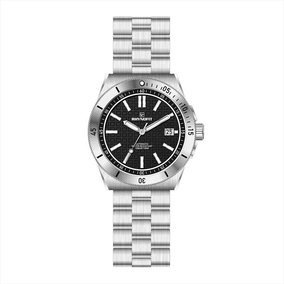 นาฬิกาข้อมือผู้ชาย RHYNOFIT แบรนด์ดัง ตัวเรือนและสายสแตนเลสสตีล 316L ขัดเงา กันน้ำ 10 ATM ระบบอัตโนมัติ เครื่องจักรกล