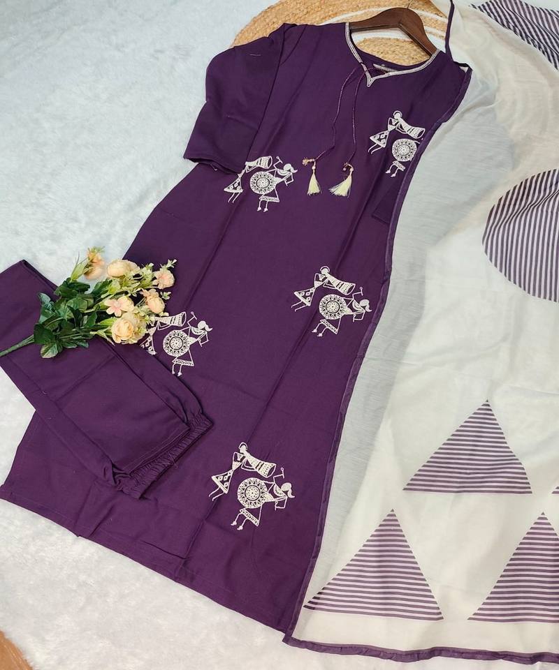 ชุดเสื้อผ้าฝ้ายผสมเรยอนปักลายหรูหรา พร้อมผ้าคลุมไหล่ สไตล์ลำลอง สีม่วง ชุดพื้นเมือง