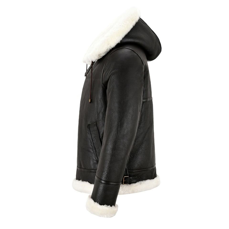 Rivian Atlantic แจ็คเก็ตหนังแกะสีดำของผู้ชาย, แจ็คเก็ตมีฮู้ดขนสัตว์สีขาวถอดออกได้แจ็คเก็ตสไตล์นักบิน