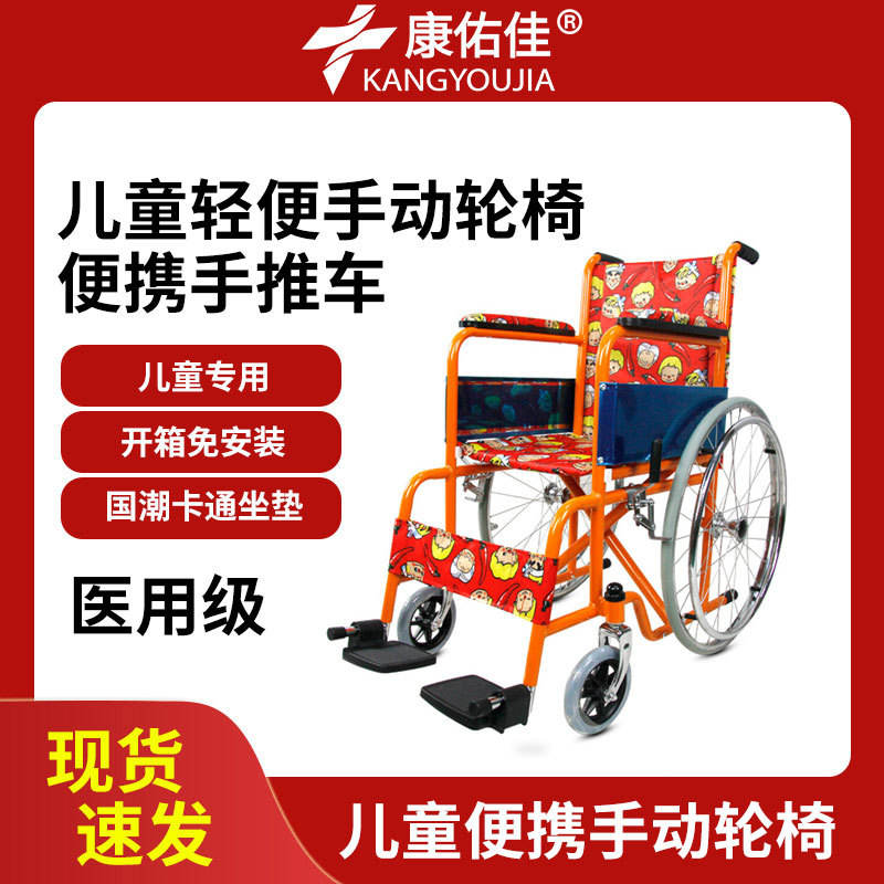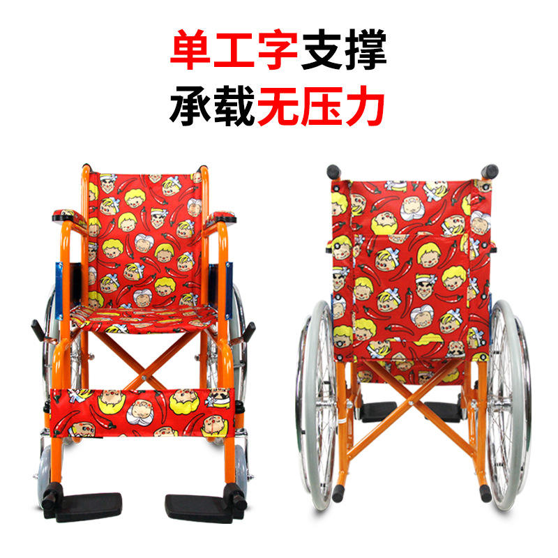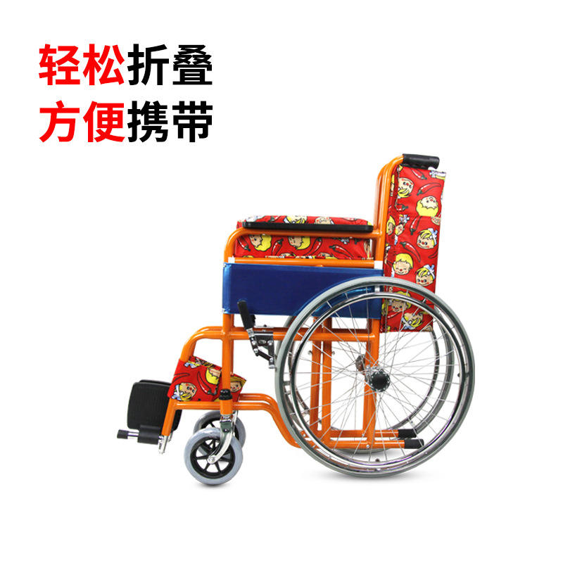 รถเข็นวีลแชร์แบบแมนนวล RJ-W809R ความกว้างที่นั่ง 38 ซม. ความลึก 40 ซม. พับได้ ลายการ์ตูนสีส้ม สำหรับเด็ก ช่วยพยุงการเคลื่อนไหว