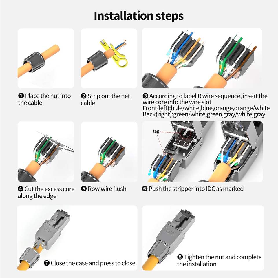 หัวต่อ RJ45 FTP SFTP แบบไม่ต้องใช้เครื่องมือ Cat7 Cat8 สำหรับสายอีเธอร์เน็ต แบบ 8P8C