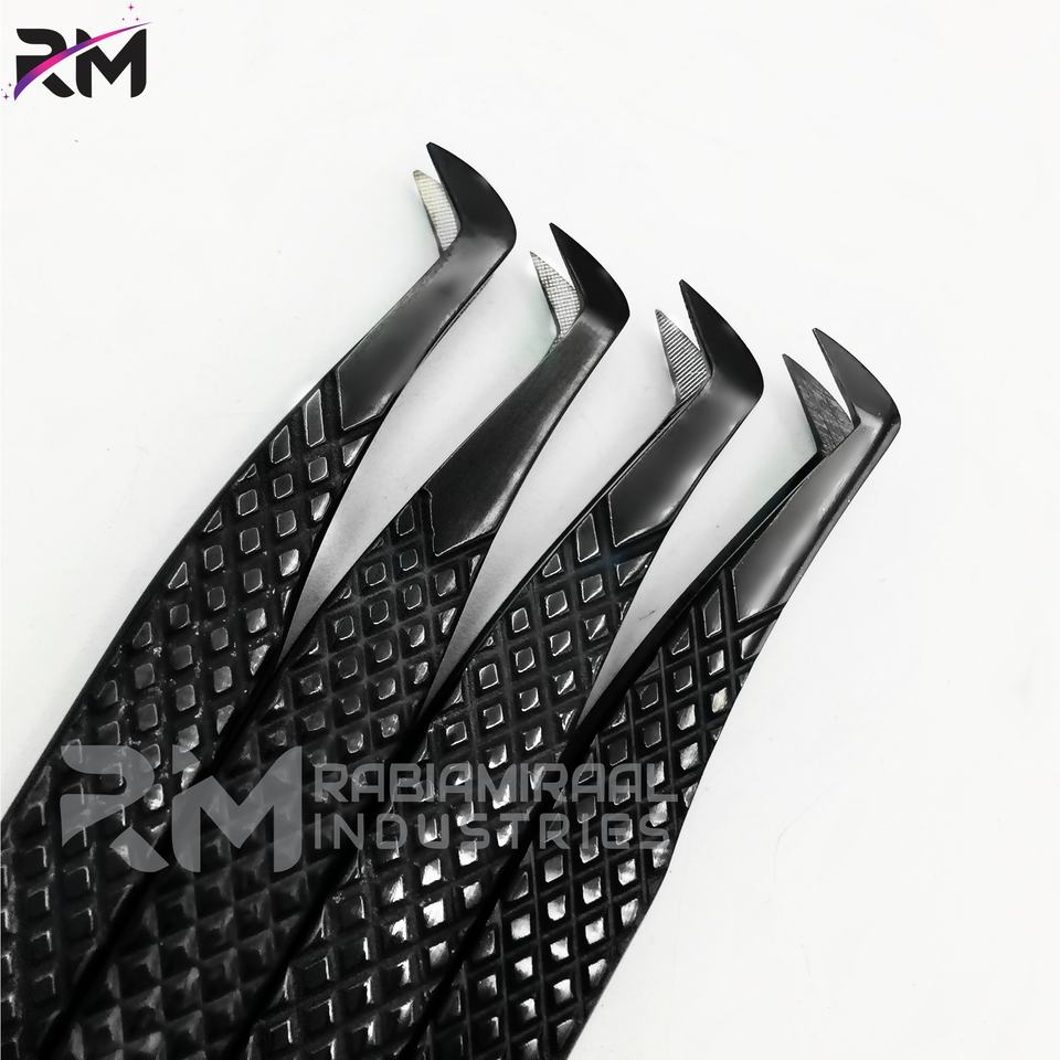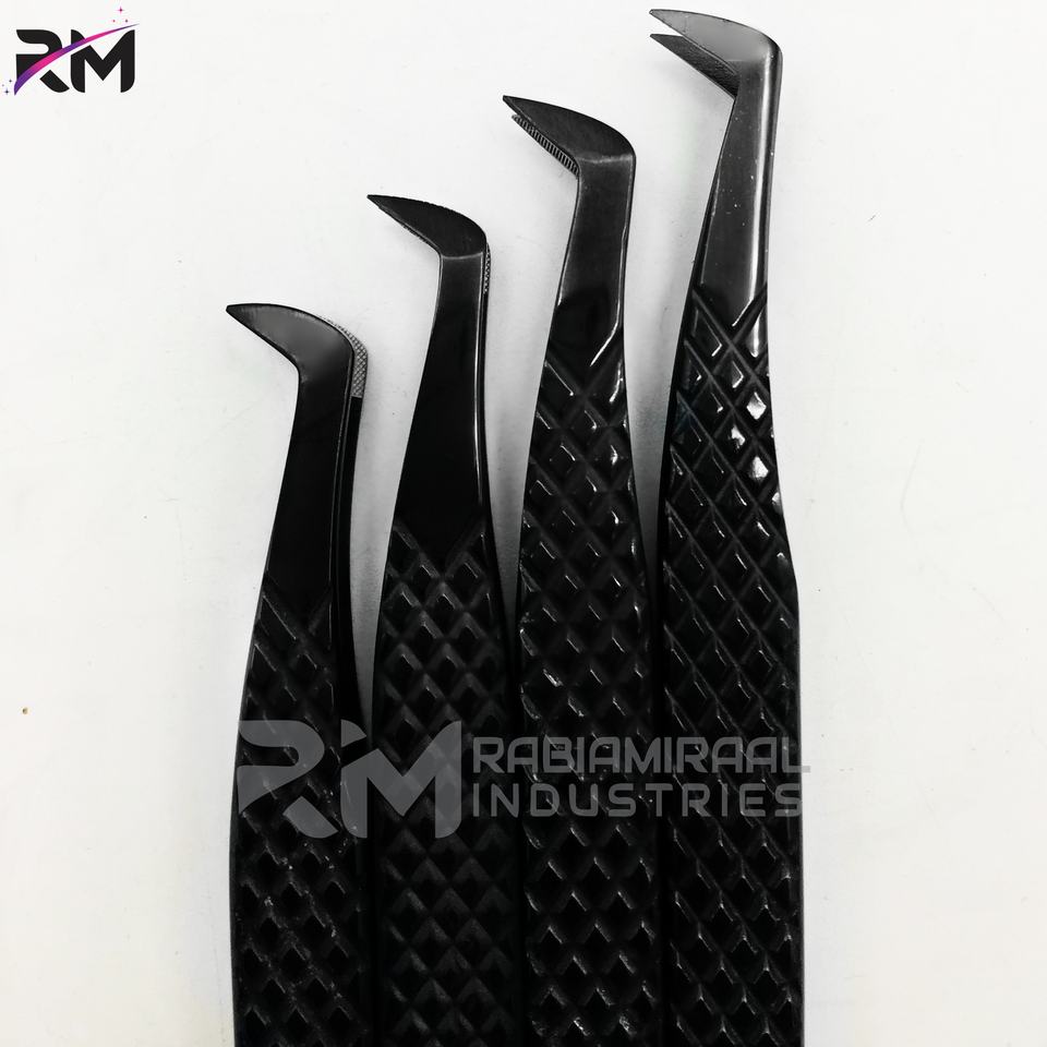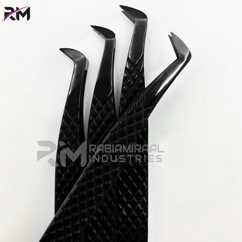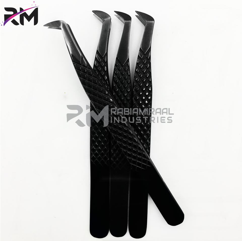 แหนบต่อขนตาปลายไฟเบอร์รูปตัวแอล 45 90 องศา ยี่ห้อ RMI สีดำ สแตนเลสสตีล ป้องกันไฟฟ้าสถิตย์ ทนทาน ความแม่นยำสูง
