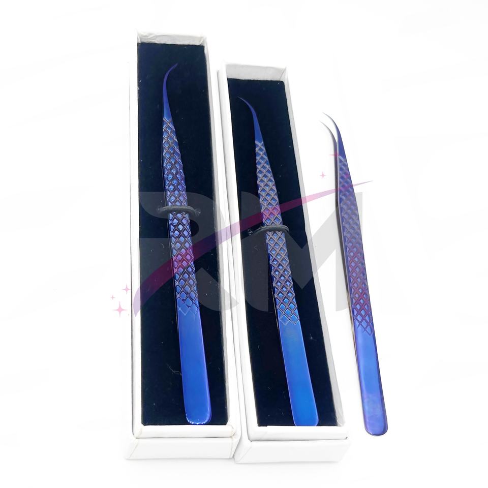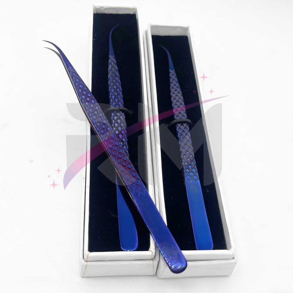 RMI ชุดปากคีบต่อขนตาสำหรับต่อขนตาสีม่วงเคลือบพลาสม่าและกล่องใส่การ์ดสีขาว