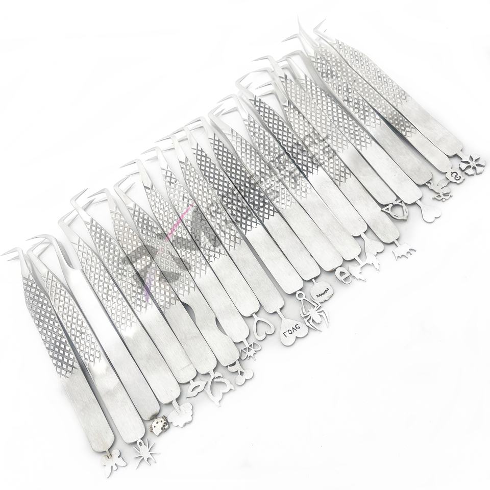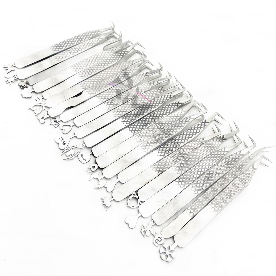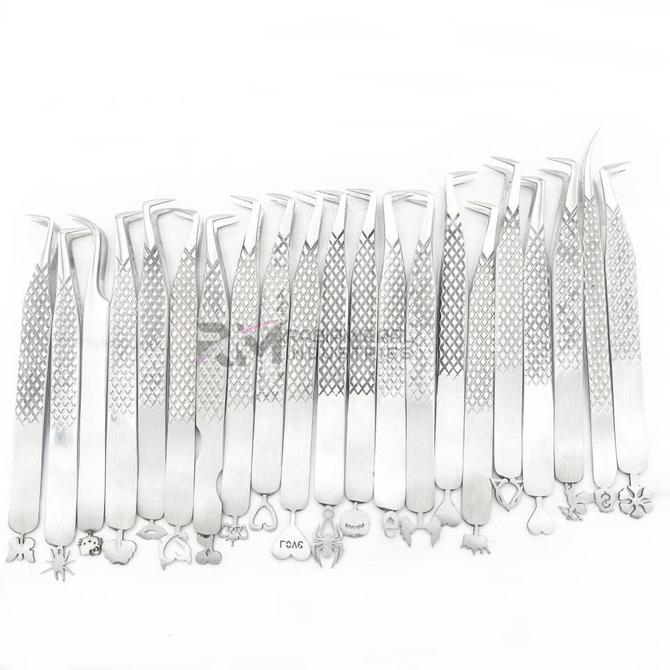 RMI Professional Super Product 21 pcs Eyelash Tweezer Silver Different Bottom Style 90 Degree Diamond Grip Eyelash Tweezer