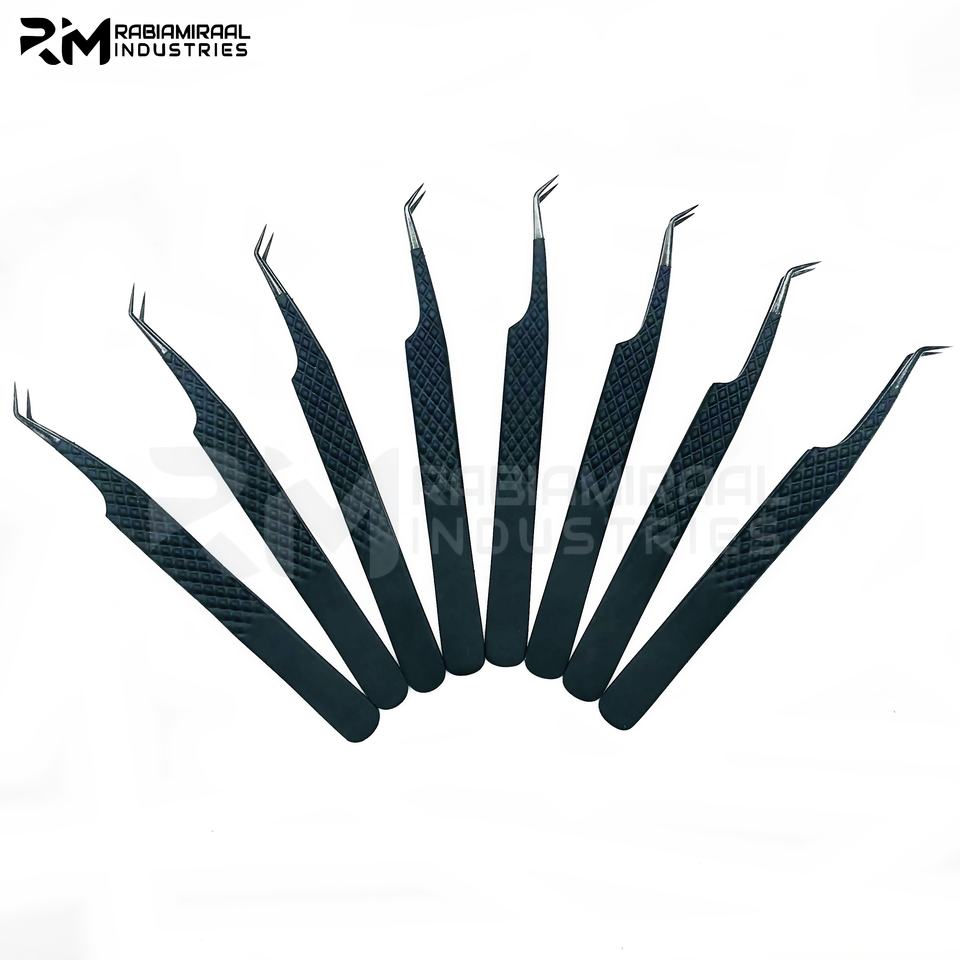 ชุดแหนบต่อขนตาสแตนเลสคุณภาพสูง RMI แบบกำหนดเอง ด้ามจับเพชร สีดำ-ดำ ปลายแหลม 45 องศา สำหรับแยกขนตา