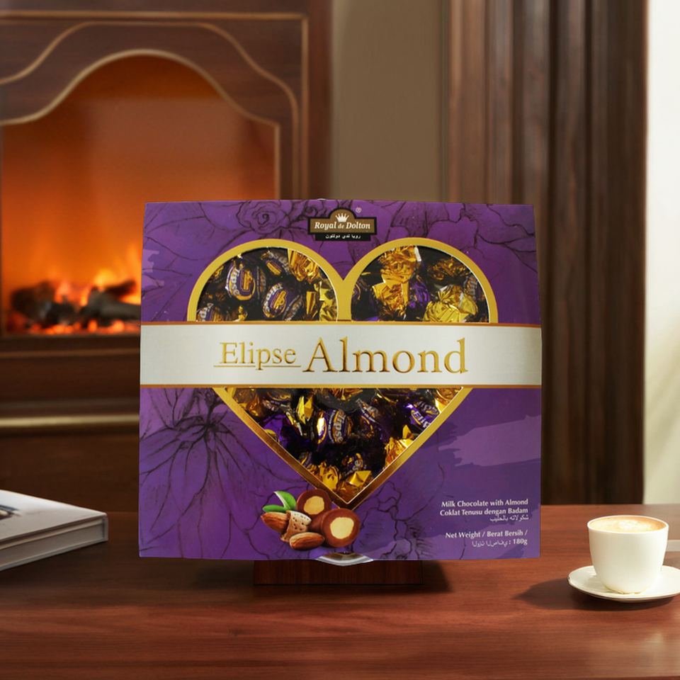 รอยัล เดอ ดอลตัน เอลิปส์ ช็อกโกแลตผสมถั่วอัลมอนด์ บิสกิตแข็ง ขนมหวาน บรรจุภัณฑ์กระดาษห่อ สีดำ-น้ำตาล พร้อมรับประทาน