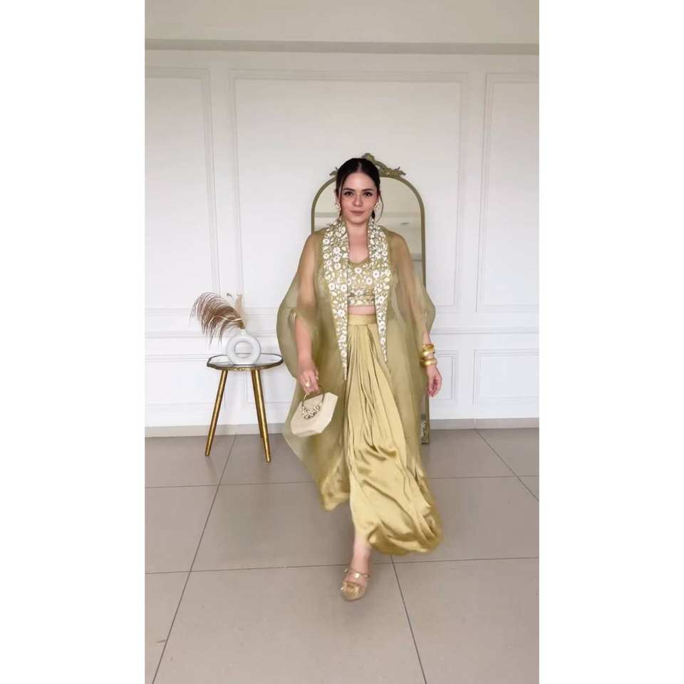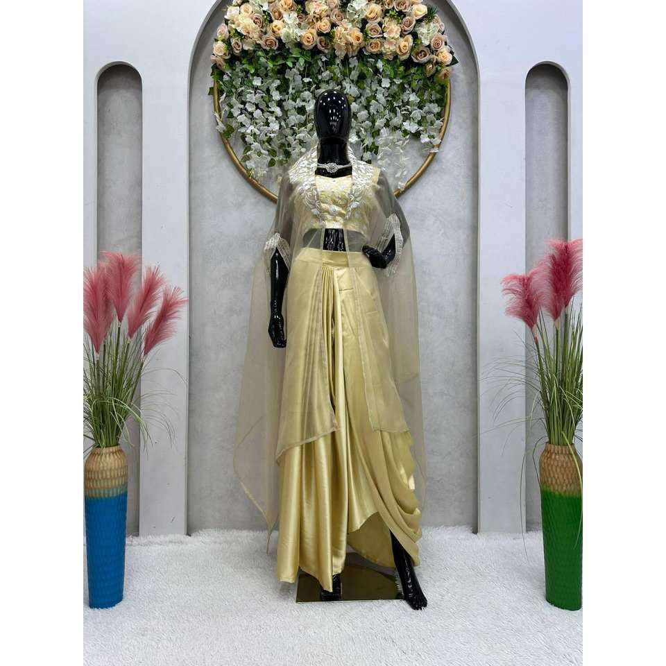 ชุดเลเฮนกาส่าหรีสีทองสำเร็จรูปจาก RTC Designer ขนาดฟรีไซส์ สำหรับงานปาร์ตี้และงานราตรี