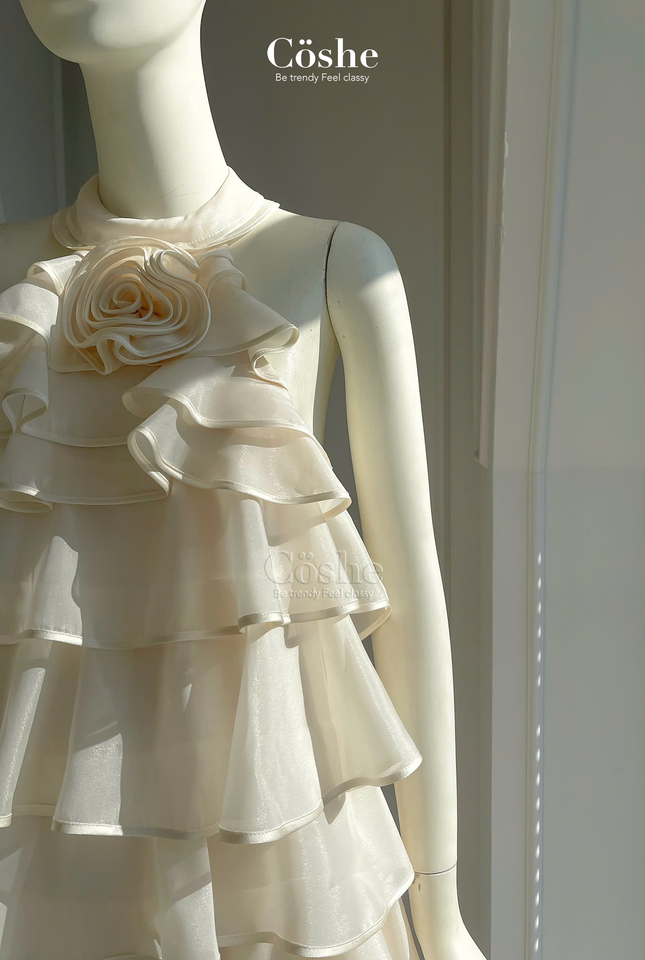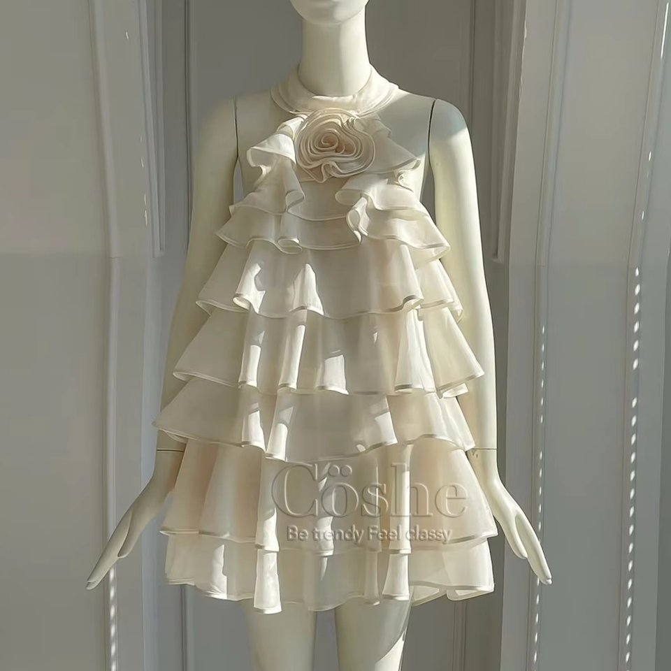 RTS coshe ชุดเดรสคอกลมมีจีบเป็นชั้นมีลายดอกไม้ชุดเดรสสำหรับงานปาร์ตี้ที่ดูอ่อนเยาว์ใส่ทุกวัน