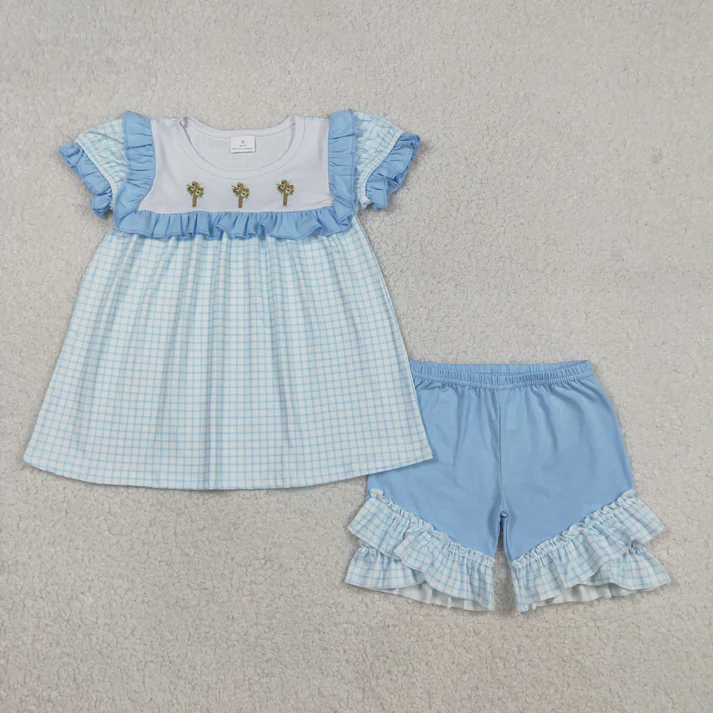 ชุดเสื้อทูนิคประดับระบายกับกางเกงขาสั้นลายกุ้ง RTS สำหรับเด็กผู้หญิง ชุดเสื้อผ้าฤดูร้อน