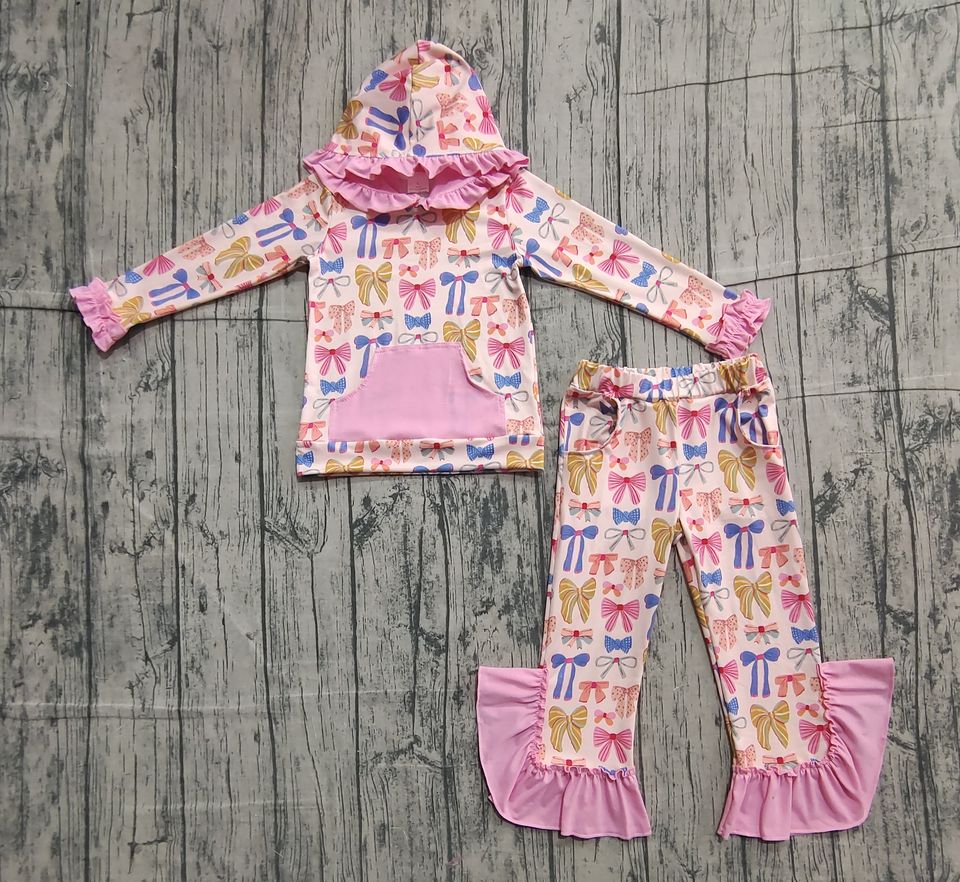 เสื้อผ้าเด็กพิมพ์ลายโบว์สำหรับเด็กผู้หญิงเสื้อผ้าเด็กแบบสวมหัวมีฮู้ดกางเกงแต่งระบายแบบสวมหัวแฟชั่น RTS