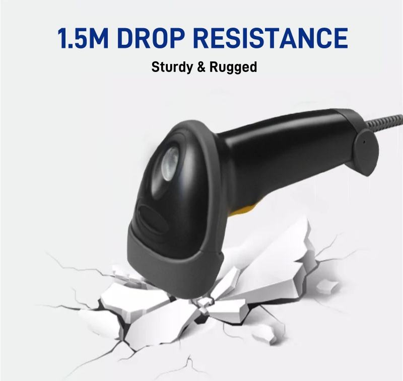 เครื่องสแกนบาร์โค้ด CMOS 2D ความเร็วสูงเครื่องอ่านรหัส QR แบบใช้สาย USB ที่ทนทานสำหรับโกดังสินค้าในซูเปอร์มาร์เก็ต