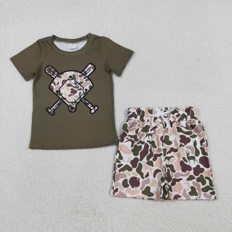 ชุดเสื้อยืดและกางเกงขาสั้นลายพรางเบสบอลสำหรับเด็กผู้ชาย 2 ชิ้น ชุดกีฬาสำหรับวันแข่งขัน ชุดเสื้อผ้าเด็กชาย