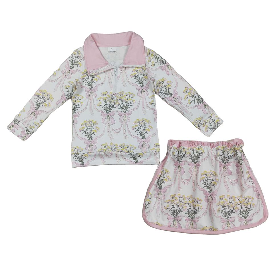 RTS Little Girl Boutique Fall Outfits Pink bows flowers yoga skirt Wholesale Toddler Child Clothing Worested Fabric skirt set