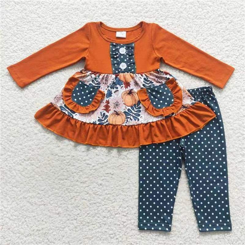 RTS NO MOQ เสื้อผ้าเด็กแขนยาวสำหรับเด็กผู้หญิงวัยหัดเดินพิมพ์ลายใบไม้ฟักทองสีส้ม