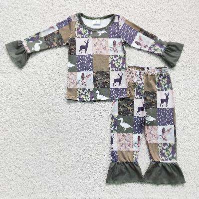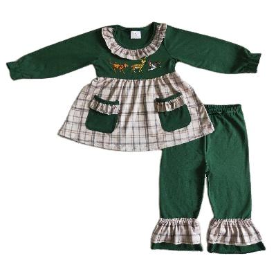 RTS NO MOQ ชุดพิมพ์ลายกวางนกเป็ดสีเขียวเสื้อผ้าสำหรับเด็กฤดูใบไม้ร่วงล่าบูติกสาวหวานขายส่ง
