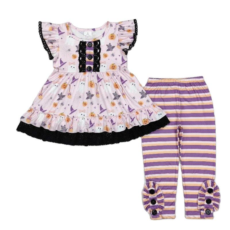 RTS NO MOQ ชุดพิมพ์ลายฟักทองค้างคาวน่ากลัวสีม่วงสำหรับเด็กเสื้อผ้าสำหรับฤดูใบไม้ร่วงวันขอบคุณพระเจ้าบูติกสาวหวานขายส่ง