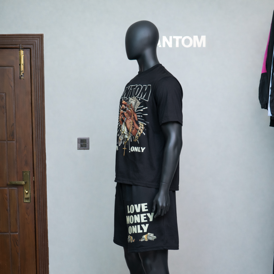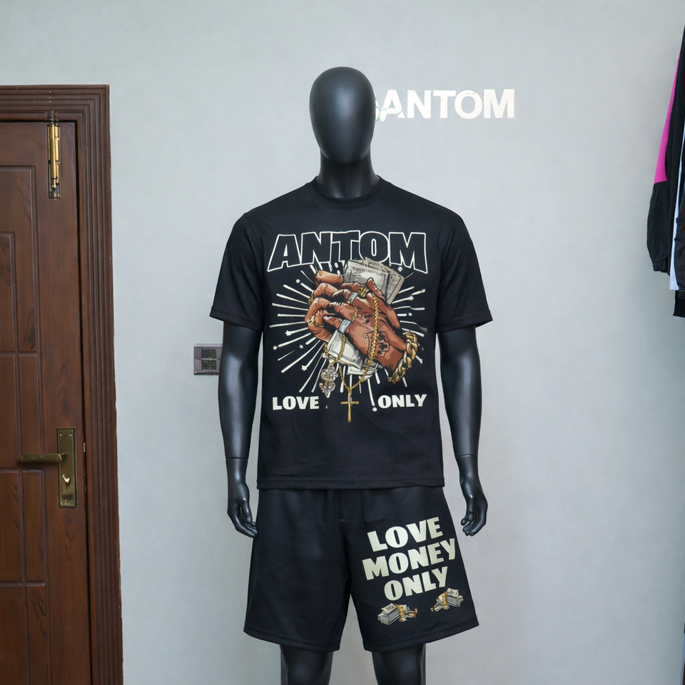 ชุดกางเกงขาสั้นและเสื้อฮู้ดดี้ ทรงยกก้น:ชุดเสื้อยืดและกางเกงขาสั้นผู้ชาย