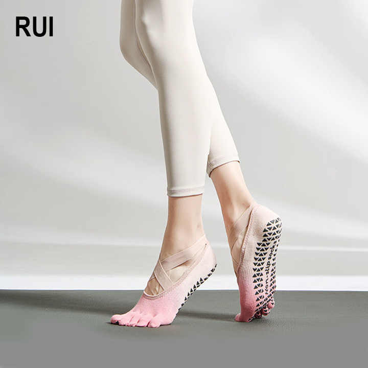 ถุงเท้าโยคะสำหรับผู้หญิง RUIQUWIN รุ่นสปริง/ซัมเมอร์ แบบมืออาชีพ ไล่เฉดสี แบบผูกเชือก กันลื่น แบบห้านิ้ว ผ้าสแปนเด็กซ์/คอตตอน ระบายอากาศได้ดี เหมาะสำหรับเต้นบัลเลต์