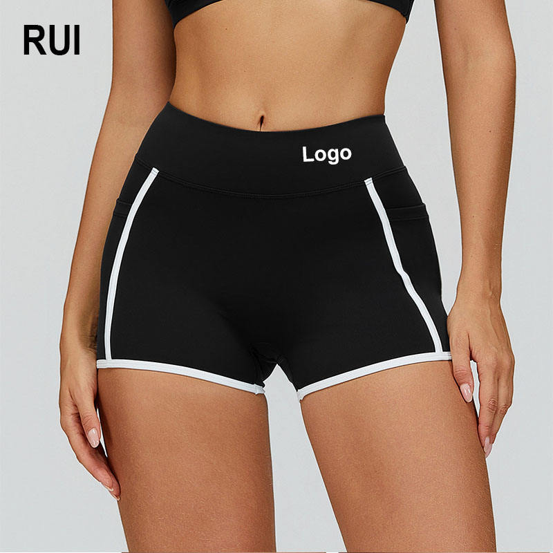 Ruiquwin กางเกงขาสั้นเอวสูงสำหรับผู้หญิงกางเกงออกกำลังกายแบบยืดได้4ทางมีกระเป๋าลายทางกางเกงโยคะวิ่งกลางแจ้ง