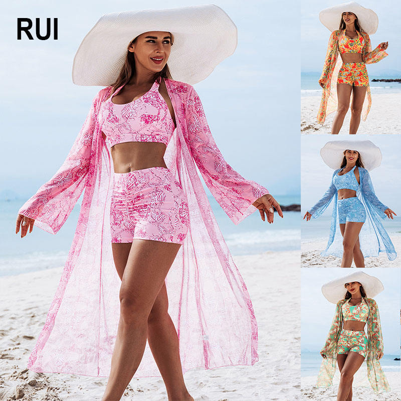 ชุดว่ายน้ำบิกินี่ 3 ชิ้น ลายดอกไม้ เอวสูง ช่วยยกกระชับ สำหรับผู้หญิง ยี่ห้อ RUIQUWIN รับผลิตแบบ OEM ODM เหมาะสำหรับวันหยุดพักผ่อนที่ชายหาด แฟชั่นไซส์ใหญ่ ขายส่ง