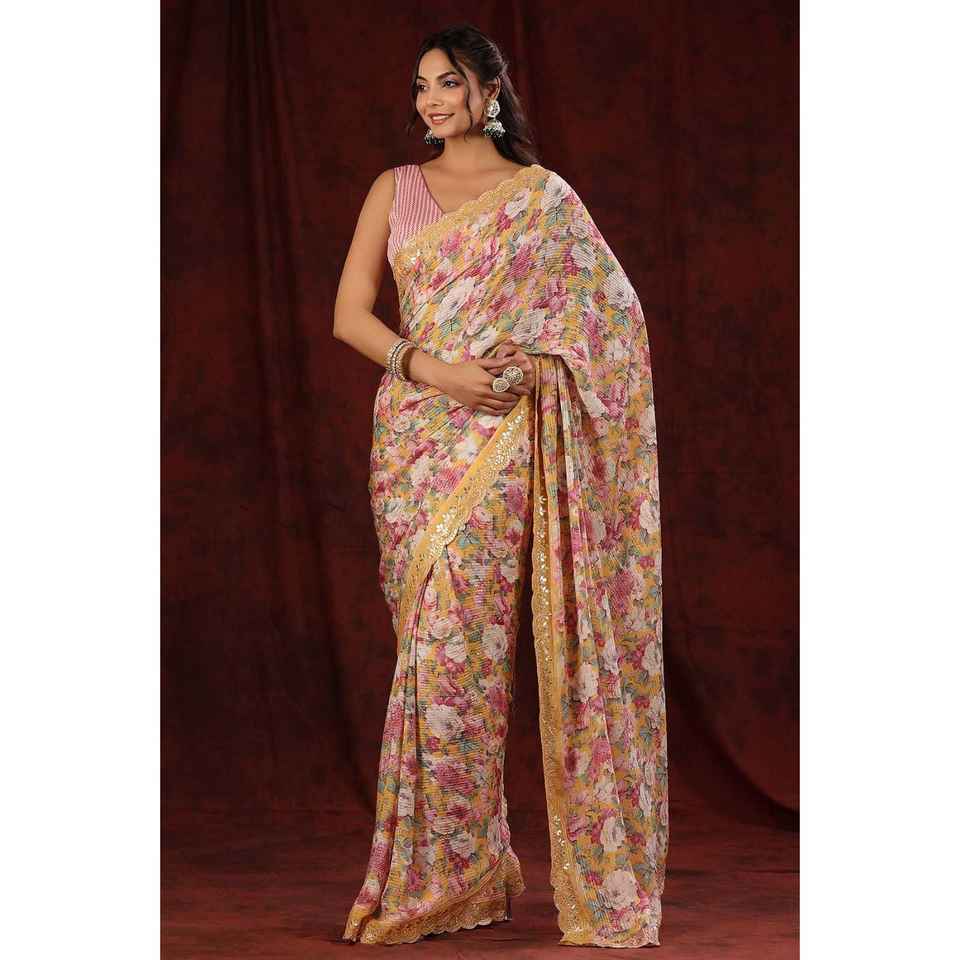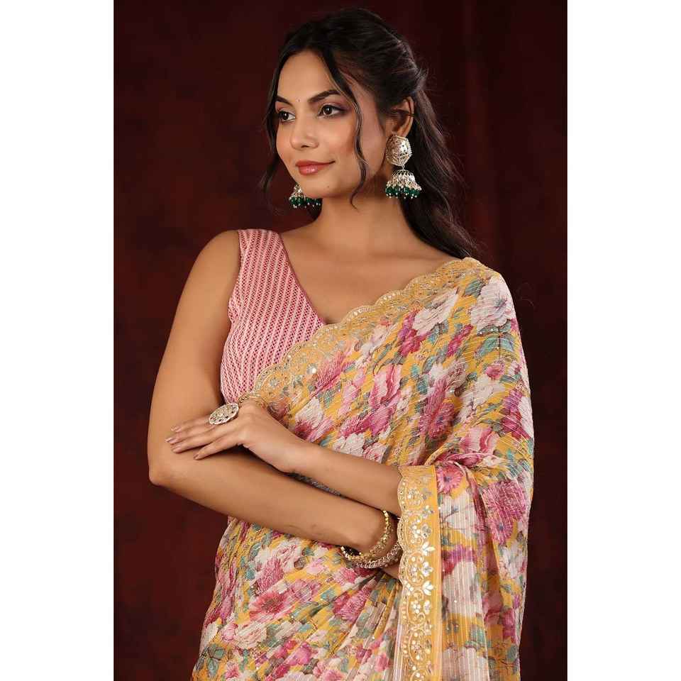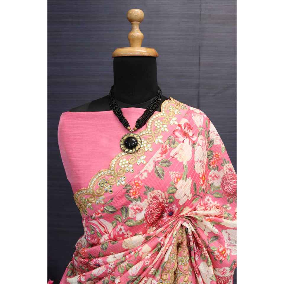 ผ้าส่าหรีพิมพ์ลายดิจิทัลลายดอกไม้สวยงามสีฟ้า แบบยังไม่เย็บติดกัน สำหรับงานเลี้ยงตอนเย็นสุดหรู
