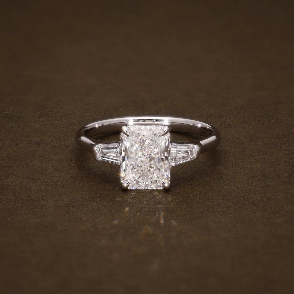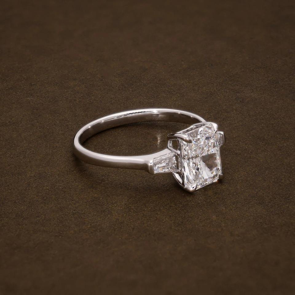 แหวนหมั้นเพชรทรงเรเดียนท์คัท F VVS เพชรเลี้ยงในห้องปฏิบัติการ น้ำหนัก 2.34 กะรัต ได้รับการรับรองจาก IGI แหวนเพชรสามเม็ด ประดับเพชรทรงบาแก็ตต์ด้านข้าง