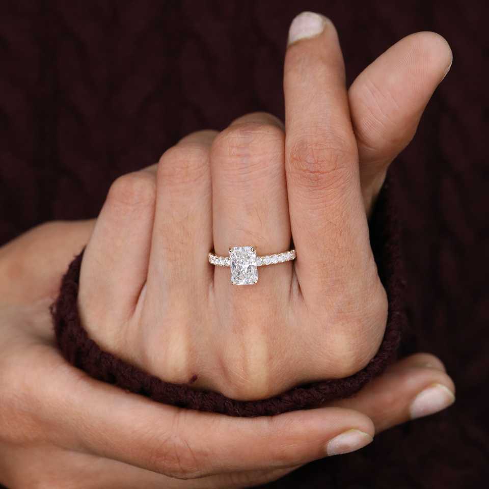 แหวนหมั้นเพชรทรงเรเดียนท์คัท ผลิตในห้องปฏิบัติการ พร้อมวงแหวนไฮโลแบบซ่อน ความใสระดับ VS1 มีตัวเลือกโลหะหลากหลาย ดีไซน์งานฝีมือที่เป็นเอกลักษณ์