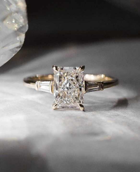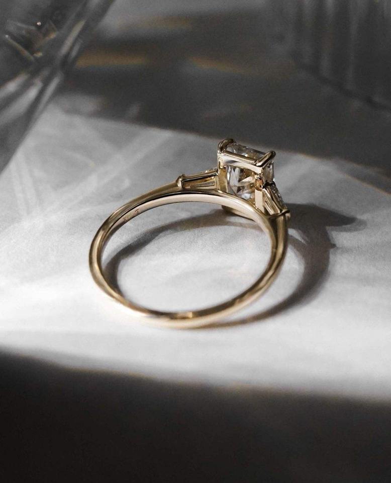 แหวนเพชรทรงเรเดียนท์คัท เพชรเลี้ยงในห้องปฏิบัติการ น้ำหนักรวม 2.20 กะรัต แหวนหมั้นเพชร CVD สามเม็ด ความใส VS1 ทองคำขาว 14K เพชรเรเดียนท์เลี้ยงในห้องปฏิบัติการ
