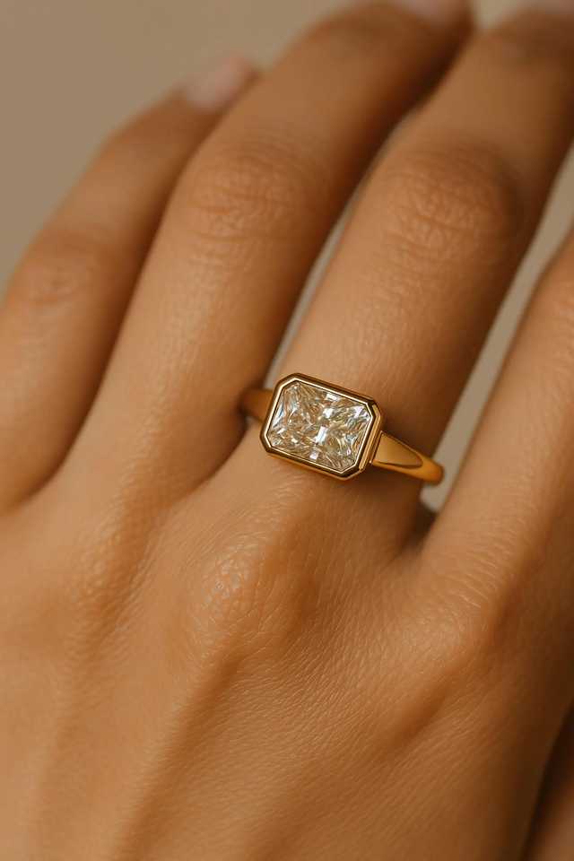แหวนหมั้นเพชรทรงเรเดียนท์คัท 3 เม็ด ประดับเพชรทรงลูกแพร์ด้านข้าง ได้รับการรับรองจาก IGI ทองคำแท้ 14K