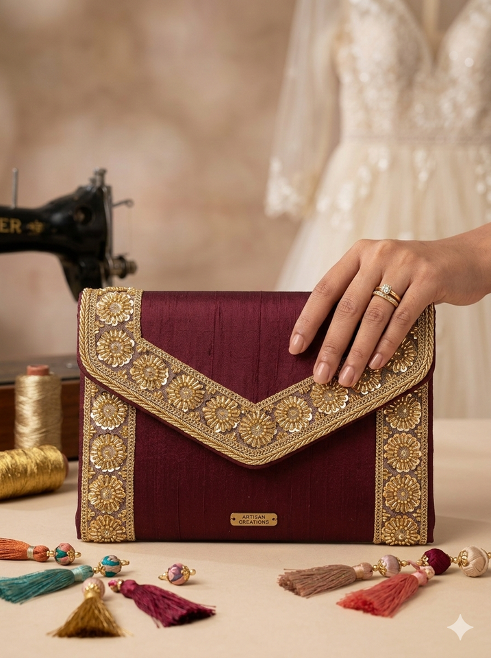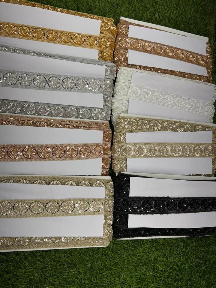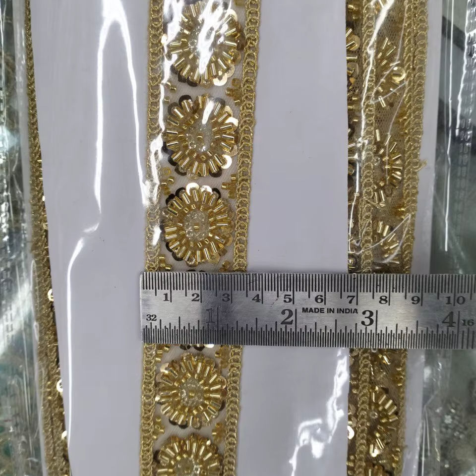 ขอบผ้าประดับคริสตัลและเลื่อมลายรัศมีทองอร่าม ปักด้วยมืออย่างประณีต สำหรับชุดเจ้าสาวและชุดราตรี ชุดประจำชาติแบบดั้งเดิม