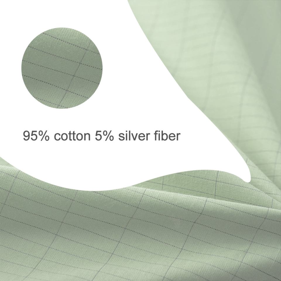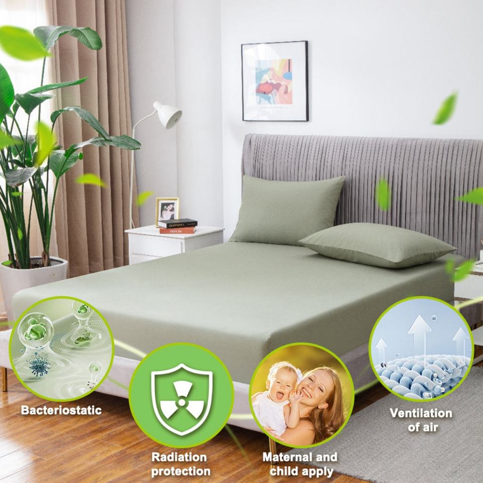 ผ้าปูที่นอนป้องกันรังสี ผสมใยฝ้ายออร์แกนิค 95% และใยเงินบริสุทธิ์ 5% ปักลาย นุ่มสบาย เหมาะสำหรับใช้ในบ้านและโรงแรม ความหนาแน่นของเส้นด้าย 200 เส้น