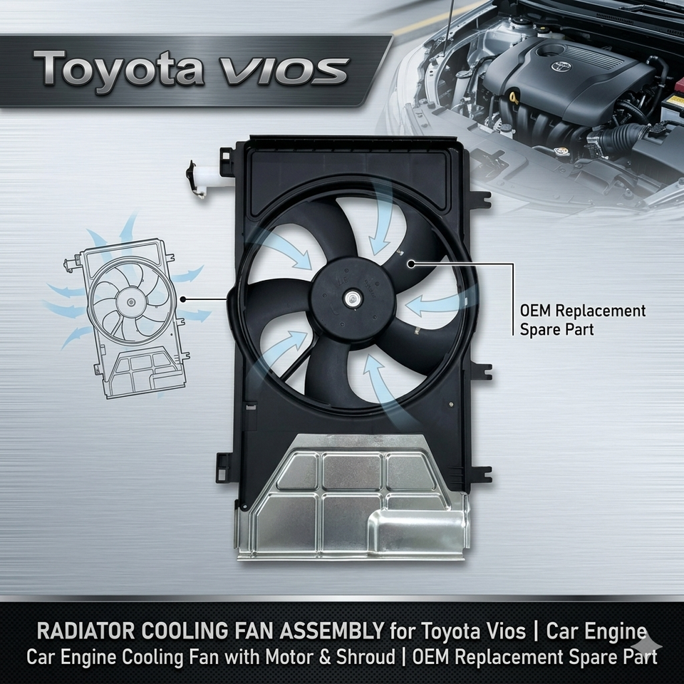 ชุดพัดลมระบายความร้อนหม้อน้ำสำหรับรถยนต์โตโยต้า วีออส | พัดลมระบายความร้อนเครื่องยนต์รถยนต์พร้อมมอเตอร์และฝาครอบ | อะไหล่ทดแทนของแท้จากผู้ผลิต (OEM)
